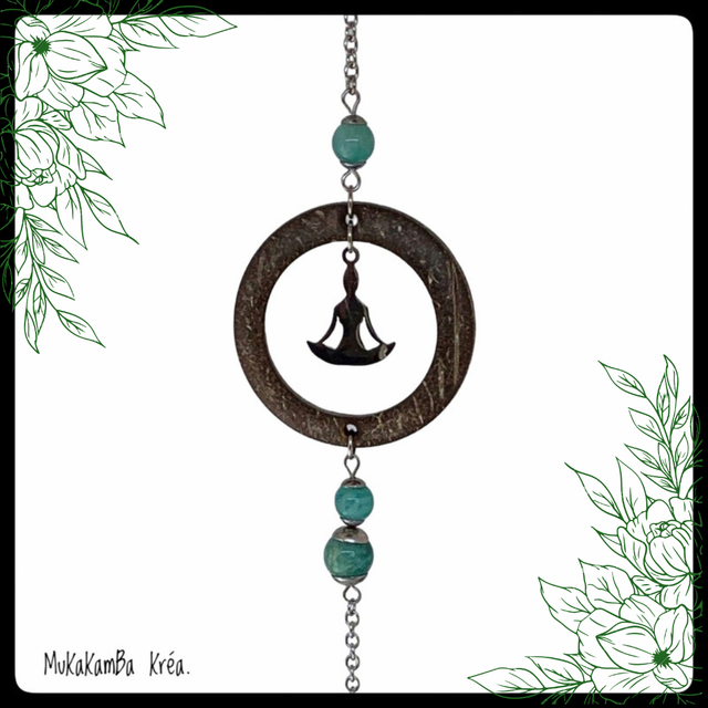 Avec un cercle en noix de coco, un personnage en train de méditer à l'interieur et des perles en pierres naturelles