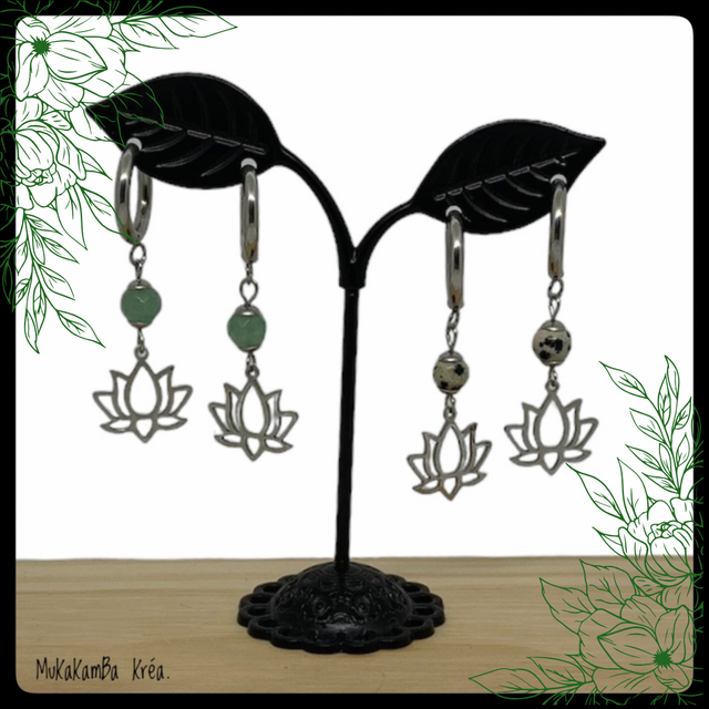 Boucles d’oreilles créoles en acier inoxydable et perles en pierres naturelles. Lotus