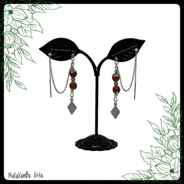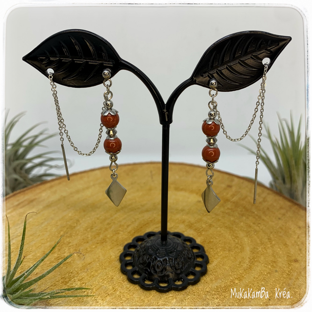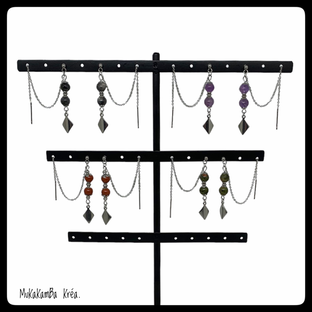 Boucles d’oreilles en acier inoxydable, chaînette à faire passer dans le second trou et perles en pierres naturelles
