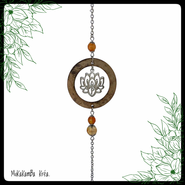 Avec un cercle en noix de coco, une fleur de lotus incrusté d'un personnage pratiquant le yoga et des perles en pierres naturelles